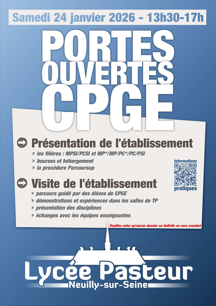 Les portes ouvertes des CPGE de la Cité scolaire Pasteur Neuilly se dérouleront le samedi 24 janvier 2026 de 13h30 à 17h00.